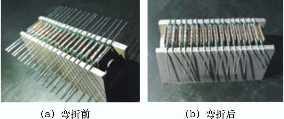 干簧管焊接前需要將其管腳由直線型彎折90°,管腳彎折后插入PCB板孔焊接,管腳彎折前后狀態(tài)如圖4所示。彎折管腳一般使用專用工裝,工裝上有凹槽并帶有磁性,可以防止彎折管腳時干簧管錯動,避免彎角時損壞干簧管,即使干簧管損壞,在焊接后檢測時也會被發(fā)現(xiàn)。在生產(chǎn)現(xiàn)場排查時,隨機(jī)彎折了一批干簧管,經(jīng)測試,干簧管性能達(dá)標(biāo)。
