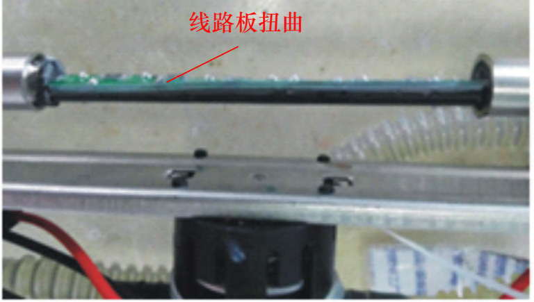 審查傳感器生產(chǎn)記錄時,發(fā)現(xiàn)該批故障件在生產(chǎn)時調(diào)整過PCB板在套管內(nèi)的安裝角度,此舉是為了使干簧管遠(yuǎn)離泵芯一邊,減小磁場對干簧管的干擾。由于調(diào)整PCB板角度時,其下部已經(jīng)灌樹脂,樹脂已在逐漸固化,此時PCB板會受到外力扭曲,可能會造成干簧管損傷。拆解另一故障件時,發(fā)現(xiàn)PCB板明顯扭曲變形,如圖5所示,失效發(fā)生在3/4擋是因?yàn)樵撎幍呐まD(zhuǎn)變形最大。