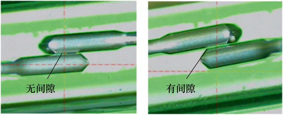 將失效的干簧管放入300倍放大儀下觀察,可以看見簧片觸點(diǎn)無間隙,而正常的簧片觸點(diǎn)則有可見間隙,如圖6所示。正常的干簧管在磁場靠近后,能觀察到簧片吸合動作,而失效的干簧管則無反應(yīng)。
